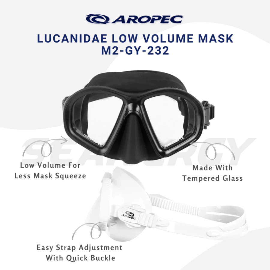 The AROPEC Lucanidae M2-GY232 is a premium low-volume mask designed specifically for freedivers, spearfishers, and underwater photographers. Featuring ultra-soft matte silicone and an ergonomic design, it ensures maximum comfort, durability, and superior visibility while reducing internal volume for effortless equalization.