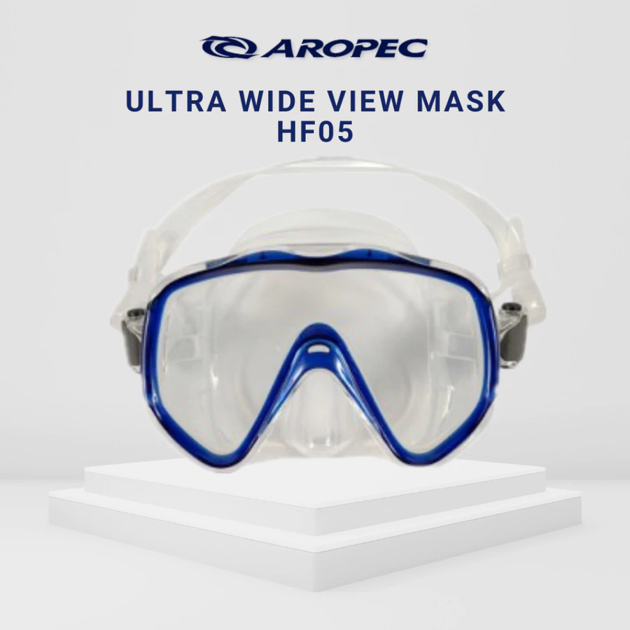 The AROPEC M1-HF05 HD Ultra Wide View mask features a single tempered glass lens, double-sealed silicone skirt, patented push-button buckles, and lightweight design for maximum comfort and panoramic underwater vision. CE certified for safety and durability.Â